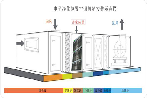 中央空調(diào)電子空氣凈化器通過中央空調(diào)循環(huán)流動風的方式對房間內(nèi)的空氣進行凈化。本凈化器由金屬過濾網(wǎng)、高壓靜電除塵器、集塵室組成。大部分 “重”的顆粒物在通過電子空氣凈化機的金屬過濾網(wǎng)時被過濾。更小的顆粒物隨氣流進入電離區(qū)(通過PWM電流型高頻變換技術,輸出7500V-8500V穩(wěn)壓、恒流的直流電壓,形成強電場)時,被高電壓電離—賦予正電荷。當帶正電荷的粒子通過帶有負電荷的集塵板(輸出4500V-5500V恒流的的直流高電壓)時被吸附在集塵板上,強電場可擊穿附著在顆粒物表面的細菌、病毒和微生物的細胞壁,并將其殺死。安裝方式:管道式、回風口式、機組式。